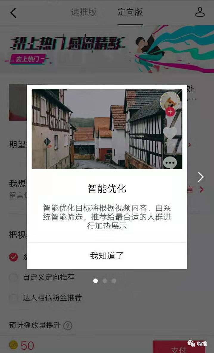 取消了DOU+定向版中的期望提升里的“购物车点击”以及“店铺引流”功能,新增了“智能优化”的功能,这个新增的DOU+投放功能是由系统智能筛选推荐目标的,没有带小黄车的视频投放DOU+是没有这个功能的,还是给这种玩法带来了一定的难度。